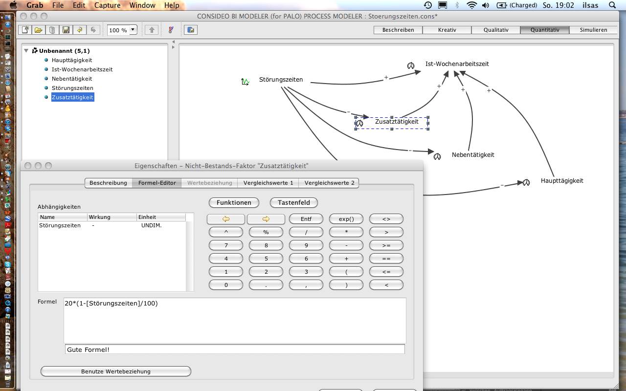 Naja, nicht ganz: Die Arbeitszeit wird durch den Bestandsfaktor Mitarbeiter und den Flussfaktor "durchschnittliche (Wochen-)arbeitszeit" per Multiplikation bestimmt, aber darum geht es mir gar nicht. Ich möchte das sich ändernde Verhältnis zwischen Haupt- und Nebentätigkeiten, Zusatztätigkeiten, und den unterschiedlichen Unterbrechungen (zusammen 100 Prozent) abbilden. Diese Veränderungen geschehen zum Beispiel Richtung "störungsbedintes Unterbrechen", wenn eine Störung auftritt, d.h. der Anteil des störungsbedingten Unterbrechen wächst, während v.a. der Anteil an Haupt- und Nebentätigkeit sinkt. Möglicherweise könnte man das auch mit absoluten Zeiteinheiten abbilden, aber die Gesamtsumme muss ja gleich der Arbeitszeit sein.