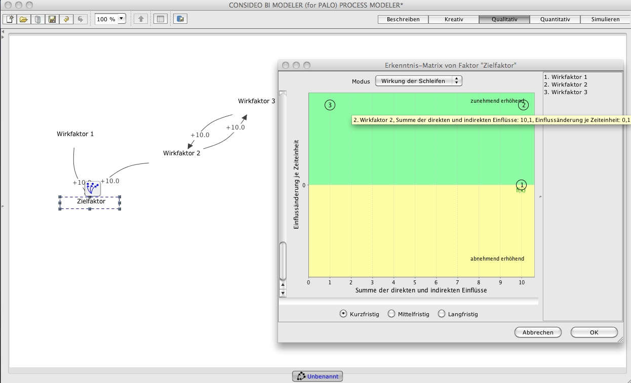 Ziel der Erkenntnis-Matrix ist die Möglichkeit, etwa Maßnahmen und Risiken hinsichtlich ihrer kurz- und langfristigen Bedeutung miteinander vergleichen zu können. Frage also beispielsweise, wie sich eine Maßnahme bei Durchführung oder ein Risiko bei Eintreten auswirken würden: der x-Wert als Summe der Wirkungen über die Wirkungsketten, und der y-Wert als Veränderung dieser Wirkung aufgrund angestoßener Wirkungsschleifen.