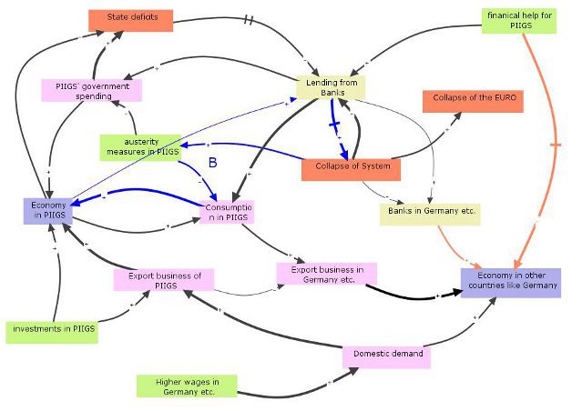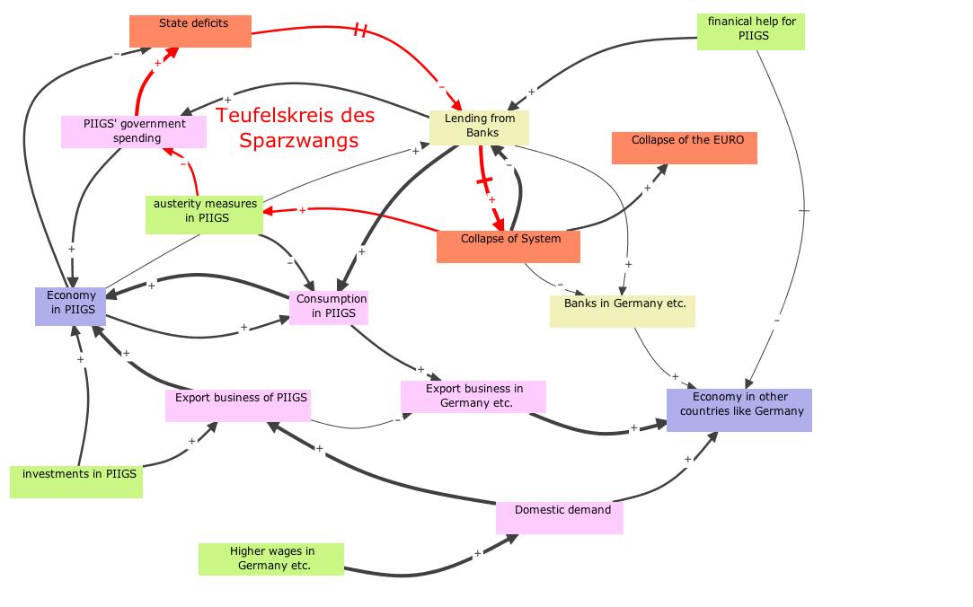In the rather conservative business magazine 'Wirtschaftswoche' former environmental minister Jürgen Trittin from the Green party offers some interesting insights on the interrelationships between the collapse of the economies of the PIIGS (Portugal, Ireland, Italy, Greece and Spain) countries and the economies of the rest of Europe. He also concludes like I did in my publications that the income e.g. in Germany heavily depends on the income in other countries that in turn either is based on a credit bubble or on our reinvestments in other countries. Also fostering the investments in other countries would an increase of the wages in e.g. Germany to support imports from other countries. That of course is not the short term interest of many lobbyists in rich countries who would like to further benefit from the postponement of the burst of bubbles by the intervention of governments and therefore the taxpayers. It is, by the way, the archetype of shifting the burden.