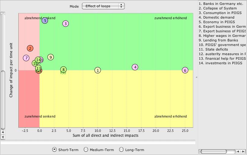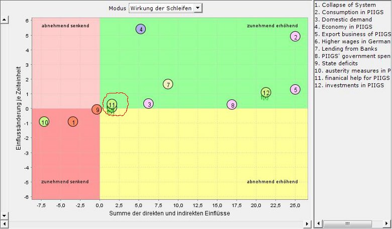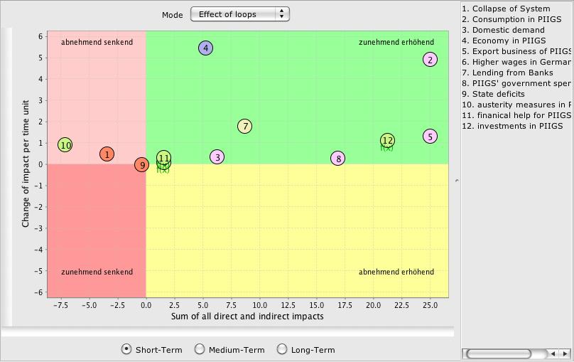 though I havn't read the related article, this is a pretty interesting. I personally think that both, the impact of banks on the economy in Germany and the financial help for ther PIIGS would have stronger impacts, respectivly (arrows marked in red). Doing so, the insight matrix change. Mainly that (not surprisingly) the impact of banks move to the right on the x-axis BUT, that the help for the PIIGS is a quite strong negativ factor on the german economy. though, looking at the impact on the PIIGS economy, the positiv effect is low.