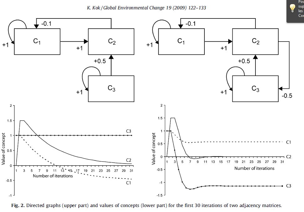 I have tried to implement a test case of FCM with iModeler, and would like to understand how calculations are done. I have implemented the example in K. Kok, Global Environmental Change 19 (2009) 122–133 (The potential of Fuzzy Cognitive Maps for semi-quantitative scenario development, with an example from Brazil), attached. To obtain the same results I had to do (fig 2b):